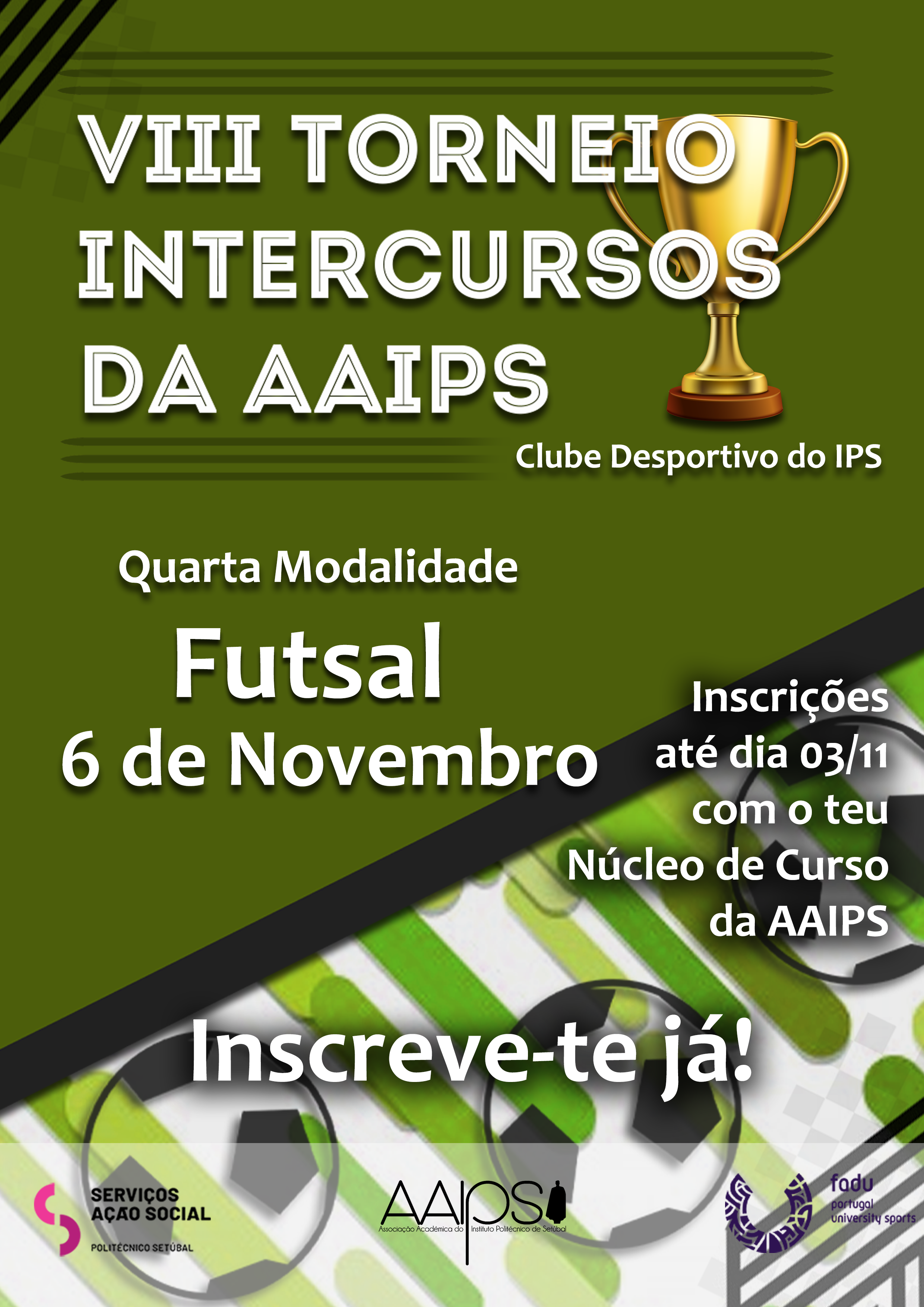 É já no próximo dia 6 de novembro que podes vir a representar o teu curso no Torneio Intercursos da AAIPS na modalidade de Futsal! As inscrições terminam no dia 3 de novembro - para participares nesta atividade, INSCREVE-TE junto ao teu Núcleo de Curso da AAIPS!